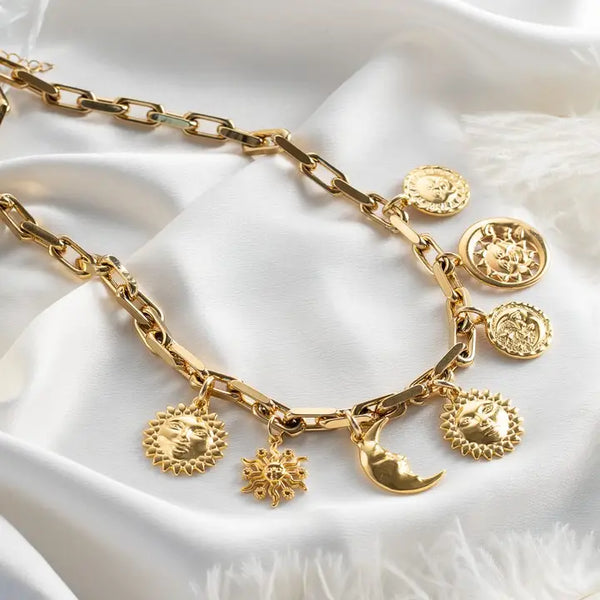 A bold gold statement necklace featuring celestial sun, moon and coin charms on a luxe chunky chain. Inspired by vintage medallions and cosmic symbols, this eye-catching piece adds drama and shine to any look. Perfect for layering or wearing solo as a powerful, radiant statement. ✨ Materials : Steel chain Goldplated copper parts Length approximately : 48cm It has extra adjustable chain